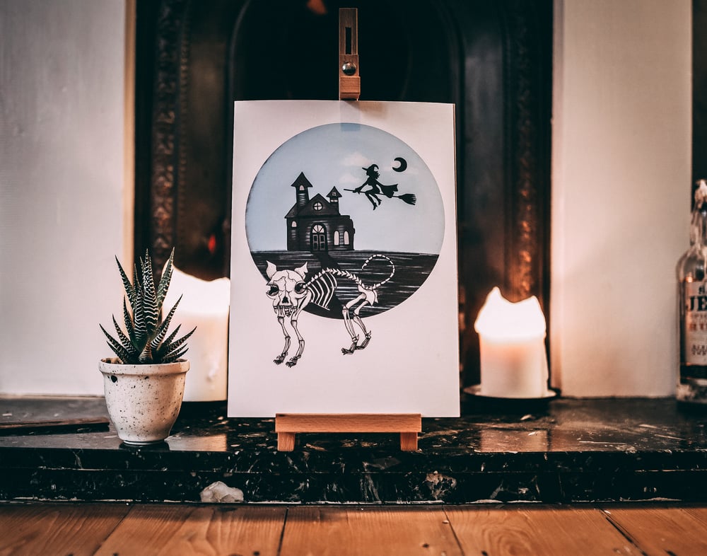 Halloween Skeleton Cat Gothic Art Print - A4 or A5